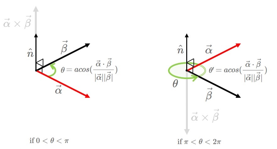 두 벡터 $\vec{\alpha}$ , $\vec{\beta}$ 와 수직인 벡터 $\hat{n}$ 을 알고 있다면, 외적으로 두 벡터의 사이각의 크기가 180도 미만인지 이상인지 알 수 있다.